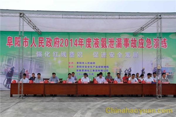 2014年6月26日上午,昊源集團(tuán)在4#尿素裝置現(xiàn)場(chǎng)舉行液氨泄漏事故應(yīng)急救援演練。省安監(jiān)局、阜陽(yáng)市政府、市安監(jiān)局、質(zhì)監(jiān)局、潁東區(qū)及市直相關(guān)單位領(lǐng)導(dǎo)親臨演練現(xiàn)場(chǎng)觀摩指導(dǎo)演練。