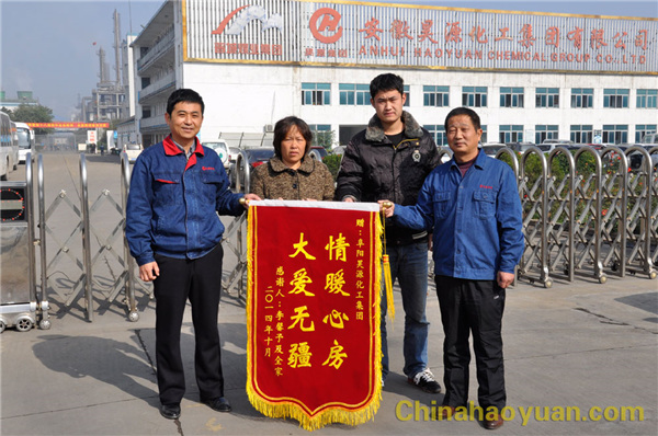 11月6日上午,阜陽市潁州區(qū)辦事處沿河村前小莊村民李馨予一家人帶著錦旗來到昊源集團(tuán),向伸出援助之手的企業(yè)表示感謝。
