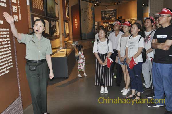 在渡江戰(zhàn)役紀念館南廣場上,屹立著當年指揮渡江戰(zhàn)役的總前委成員鄧小平、劉伯承、陳毅、粟裕、譚震林五位老一輩革命家雕像,讓人肅然起敬。在合影留念后,昊源集團一行人在工作人員帶領下參觀了渡江戰(zhàn)役紀念館。進展館由左至右巨大的群雕“勝利之師”,再現(xiàn)了渡江戰(zhàn)役五位領導人指揮百萬雄師橫渡長江時驚心動魄的宏偉場景,位于展館四周有“8000多烈士名單”以及“無名烈士紀念碑”。這一幕幕場景、一幅幅圖片、一件件陳列品、一串串數(shù)字頌揚著中國人民解放戰(zhàn)爭的偉大勝利,也銘刻著人民群眾不顧生命危險,英勇支援前線,與人民軍隊一起浴血奮戰(zhàn)的歷史印跡,在場黨員同志深深為革命前輩不畏艱險、勇往直前的渡江精神所感染、所鼓舞、所震撼。