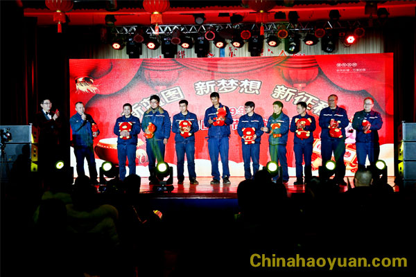 公司領(lǐng)導(dǎo)凡殿才、高玉磊、楊捷、田懷廣、高明林、張海生、王衛(wèi)峰、潘家成、吳珍漢、張超依次走上舞臺,與演員握手問候,合影留念。