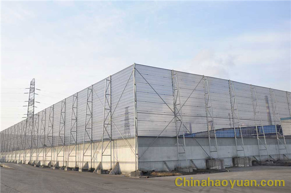 在煤場、渣場地、東廠界(共7處)周圍建設(shè)防風(fēng)抑塵網(wǎng):總長度2600米,高10米,總面積約21000平方米,總投資268萬元。該工程于2014年3月開工建設(shè),2015年2月建成投用。防風(fēng)抑塵網(wǎng)擋風(fēng)板采用新型三峰防風(fēng)抑塵網(wǎng)板,其原理是是利用空氣動力學(xué)原理,按照現(xiàn)場環(huán)境加工成一定幾何形的擋風(fēng)板,并根據(jù)現(xiàn)場條件將擋風(fēng)板組合成擋風(fēng)抑塵墻,使流通的空氣(強(qiáng)風(fēng)) 從外通過墻體時,在墻體內(nèi)測形成上、下干擾的氣流,已達(dá)到外側(cè)強(qiáng)風(fēng),內(nèi)側(cè)弱風(fēng),外側(cè)小風(fēng),內(nèi)側(cè)無風(fēng)的效果,從而防止粉塵的飛揚(yáng),達(dá)到抑塵的效果。新設(shè)置的擋風(fēng)抑塵墻可有效降低來流風(fēng)的風(fēng)速,改變一部分來流風(fēng)通過擋風(fēng)抑塵墻后的風(fēng)向,最大限度地?fù)p失來流風(fēng)的動能,避免來流風(fēng)的明顯渦流,減少風(fēng)的湍流度而達(dá)到減少起塵的目的。綜合抑塵率>85%,完全滿足環(huán)保要求。