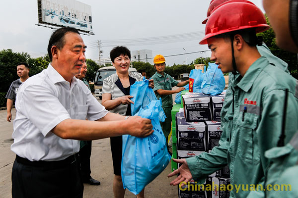 孫正東一行在凡殿才等公司領(lǐng)導(dǎo)陪同下,來到航天爐生產(chǎn)系統(tǒng),慰問正在生產(chǎn)崗位工作的昊源干部、員工,關(guān)切地詢問他們的工作、生活情況,叮囑他們注意高溫作業(yè)安全,并親自將防暑降溫用品送到他們手里。