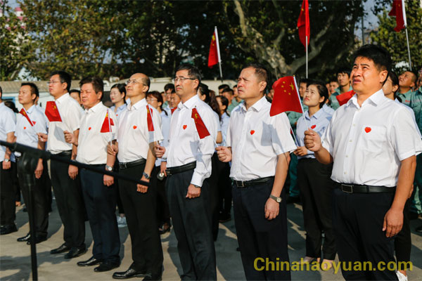 上午8時(shí)18分,升旗儀式開始。鮮艷的五星紅旗在莊嚴(yán)的國(guó)歌聲中冉冉升起,凡殿才等公司領(lǐng)導(dǎo)同員工代表注視著五星紅旗,齊唱國(guó)歌。