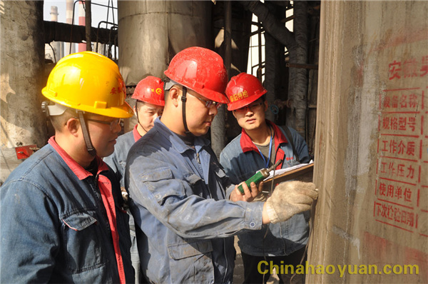 圖為動力處和阜陽市特種設(shè)備監(jiān)督檢驗中心有關(guān)人員對設(shè)備進行檢測。