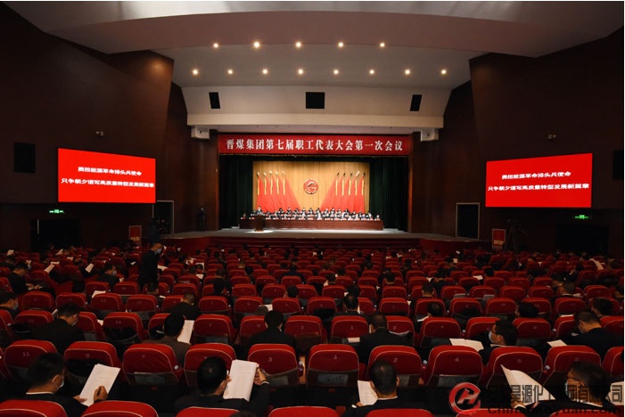 晉煤集團(tuán)七屆一次職代會(huì)會(huì)場(chǎng)內(nèi),主席臺(tái)后幕正中由晉煤標(biāo)志“JM”縮寫組合而成的企徽,在分列兩側(cè)的10面鮮艷紅旗映襯下熠熠生輝。二樓眺臺(tái)上懸掛著“勇?lián)茉锤锩蓬^兵使命 只爭(zhēng)朝夕譜寫高質(zhì)量轉(zhuǎn)型發(fā)展新篇章”的橫幅。整個(gè)會(huì)場(chǎng)氣氛莊嚴(yán)熱烈。