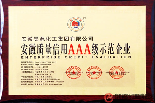 安徽省徽企質(zhì)量信用評價(jià)中心和安徽企業(yè)信用等級評價(jià)專家委員會(huì)依據(jù)GB/T23794-2015《企業(yè)信用評價(jià)指標(biāo)》、Q/AH/HQXY001-2019《企業(yè)信用等級評價(jià)管理辦法》,針對昊源公司的信用記錄、經(jīng)營狀況、財(cái)務(wù)指標(biāo)、發(fā)展前景,結(jié)合國家及地方相關(guān)政策,本著公平、公正、獨(dú)立、客觀、科學(xué)原則,評定安徽昊源化工集團(tuán)有限公司企業(yè)信用等級為:安徽質(zhì)量信用AAA級示范企業(yè)。并為公司頒發(fā)了牌匾及證書。
