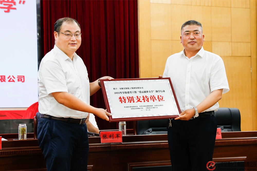 隨后,團(tuán)市委書記汝磊向昊源公司頒發(fā)2022年阜陽希望工程“愛心圓夢大學(xué)”助學(xué)行動特別支持單位獎牌,感謝昊源公司多年來對愛心助學(xué)行動等公益事業(yè)的大力支持。