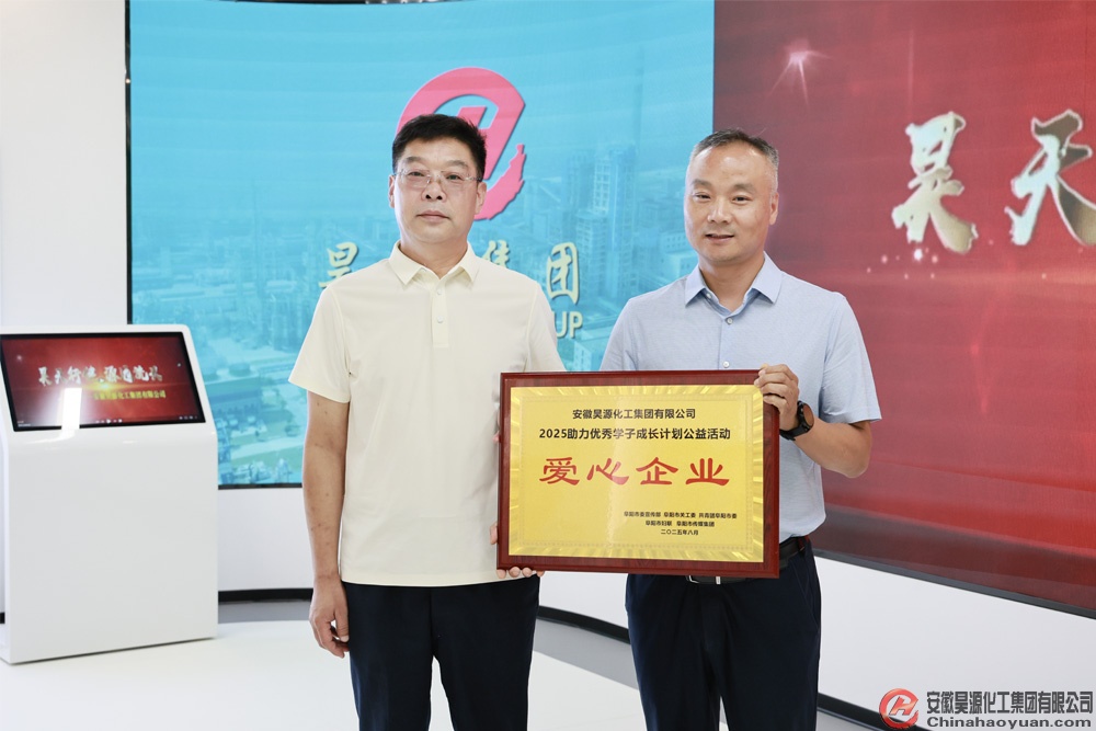 優(yōu)秀學(xué)子參觀昊源展廳,深入了解昊源公司發(fā)展歷程、產(chǎn)業(yè)布局、科技創(chuàng)新等情況。劉振亞為優(yōu)秀學(xué)子頒發(fā)勵(lì)志助學(xué)金,安徽昊源化工集團(tuán)有限公司被授予“愛(ài)心企業(yè)”光榮稱(chēng)號(hào)。
