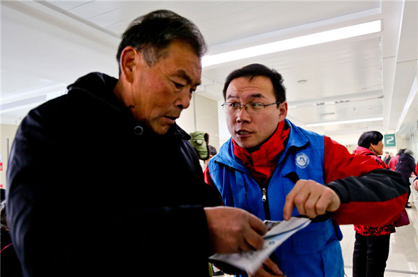目前,在市人民醫(yī)院城南新區(qū)門診設(shè)置有10余臺自助機(jī),不但可以掛號,還可以繳費(fèi),查詢?!澳谶@里刷一下身份證,就會出來一張就診卡,您劃錢進(jìn)去,掛個號……”志愿者張海華在一臺自助機(jī)前一步步地指導(dǎo)患者操作。“現(xiàn)在看病就診都智能化了,但是有很多患者并不會使用?!睆埡HA是安徽昊源化工集團(tuán)有限公司的一名職工,這些天只要有空他就會來醫(yī)院義務(wù)服務(wù),為此,他犧牲了自己的休息時間?!白蠲Φ臅r候,都不敢多喝水。因?yàn)槟遣皇且粋€人一個人地來問,而是一群人蜂擁上前來咨詢。”
