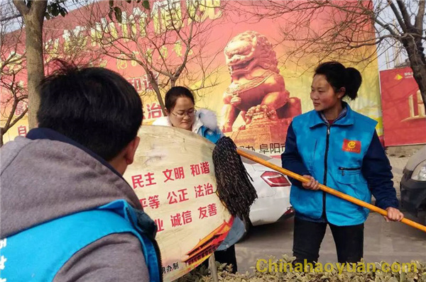 志愿者三十余人共分四隊(duì),分別沿著北京東路、向陽(yáng)路、潁河?xùn)|路、阜渦路進(jìn)行清理、打掃衛(wèi)生,看到傾斜的志愿標(biāo)志牌,志愿者們合力把它扶正并將它擦干凈。