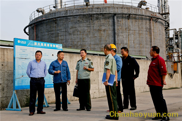 楊捷感謝各級消防部門對昊源公司發(fā)展的大力支持和幫助,向史平松一行匯報了公司消防工作開展情況。他說,昊源公司配置有專業(yè)消防隊,消防員共計40余人。配備有火災(zāi)報警控制器、泡沫消防車、氣防車、蓄水消防站、泡沫泵等硬件設(shè)施。消防站24小時專人值守,可以隨時應(yīng)急啟用。新員工上崗前嚴格落實“三級”安全教育培訓(xùn)制度,并經(jīng)過測試合格后方可到崗作業(yè);公司每月組織兩個車間進行反事故應(yīng)急演練,尤其是6月份的安全月活動,單位舉辦應(yīng)急防護器材使用、消防救援、傷員救護等一系列技能競賽,使一線人員做到應(yīng)知、應(yīng)會。在異丙胺罐區(qū)舉行的反事故應(yīng)急演練中,潁東消防大隊領(lǐng)導(dǎo)親臨指導(dǎo),使公司消防隊伍得到進一步鍛煉。