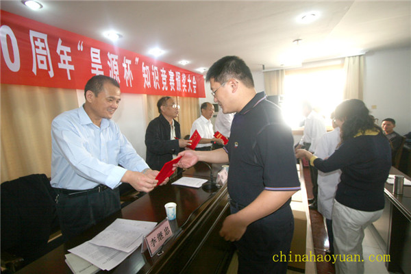 9月29日上午,慶祝建國60周年“昊源杯”知識競賽頒獎大會在阜陽市直工委會議室隆重舉行 。阜陽市委常委、市委秘書長亓龍,安徽昊源化工集團(tuán)有限公司黨委副書記李繼忠等出席了本次頒獎大會。此次知識競賽是由市直工委、市委黨史研究室、市經(jīng)委等單位聯(lián)合組織,昊源化工集團(tuán)獨(dú)家冠名贊助舉辦。本次活動旨在慶祝建國60周年,進(jìn)一步弘揚(yáng)愛國主義精神,讓廣大干部群眾了解黨的光輝歷史。自7月4日活動開展以來,截至9月15日止,共收到答卷2881份,其中505份全部正確。經(jīng)評審團(tuán)評審,共評出一等獎5名、二等獎10名、三等獎20名、紀(jì)念獎30名和組織獎5個。圖為公司黨委副書記李繼忠向獲獎選手頒獎。(公司辦:朱梅)