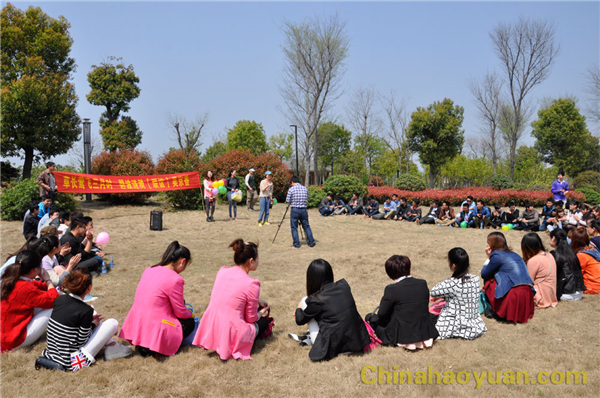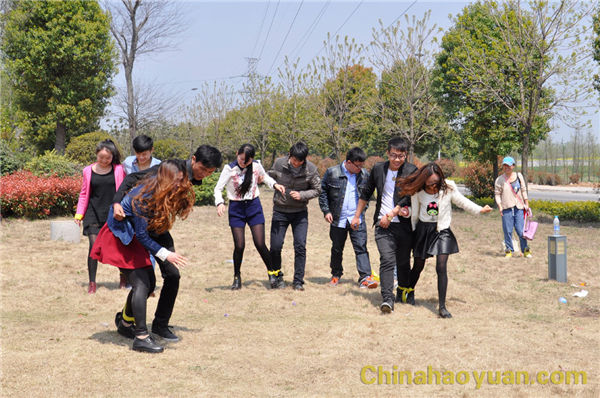 不知不覺經(jīng)過兩個(gè)小時(shí)的行駛,我們終于到達(dá)了本次活動(dòng)的目的地:潁上濕地公園。望著對(duì)面一群群時(shí)尚靚麗的女孩,我們公司男生頓時(shí)興致高昂,此時(shí),在團(tuán)委書記馮婷婷的帶頭組織下,大家選取公園一角,圍坐成一圈,在相互介紹姓名和愛好后,開始了愉快的游戲時(shí)光,“昊京香”三家公司男女生互相搭配,默契的完成了一系列游戲動(dòng)作。