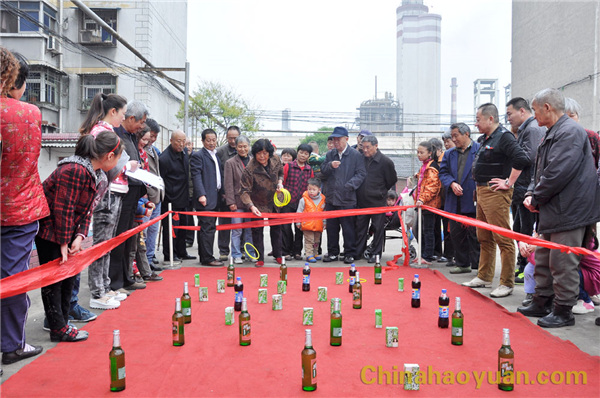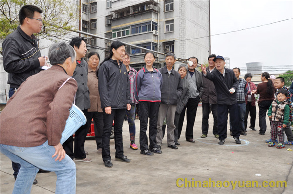 運(yùn)動(dòng)會(huì)項(xiàng)目為心靈手巧 (快樂套圈游戲)、心花怒放(吹乒乓球游戲)、心有靈犀(投擲羽毛球游戲)、心明眼亮(投筷子入啤酒瓶比賽)等四個(gè)項(xiàng)目, 100多名退休老職工參加趣味比賽。
