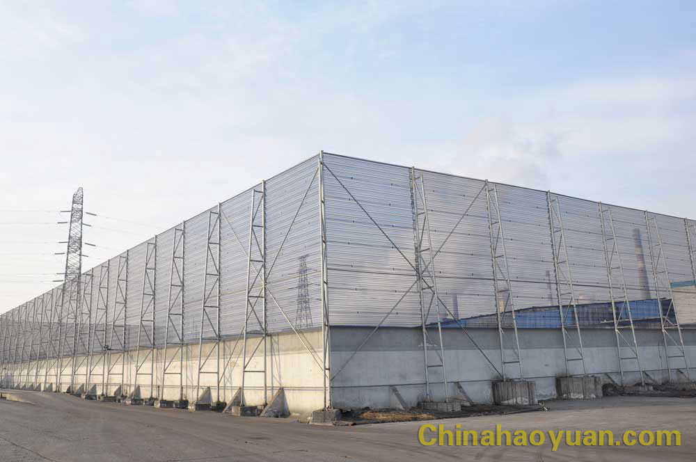 在煤場、渣場地、東廠界(共7處)周圍建設防風抑塵網:總長度2600米,高10米,總面積約21000平方米,總投資268萬元。該工程于2014年3月開工建設,2015年2月建成投用。防風抑塵網擋風板采用新型三峰防風抑塵網板,其原理是是利用空氣動力學原理,按照現(xiàn)場環(huán)境加工成一定幾何形的擋風板,并根據(jù)現(xiàn)場條件將擋風板組合成擋風抑塵墻,使流通的空氣(強風) 從外通過墻體時,在墻體內測形成上、下干擾的氣流,已達到外側強風,內側弱風,外側小風,內側無風的效果,從而防止粉塵的飛揚,達到抑塵的效果。新設置的擋風抑塵墻可有效降低來流風的風速,改變一部分來流風通過擋風抑塵墻后的風向,最大限度地損失來流風的動能,避免來流風的明顯渦流,減少風的湍流度而達到減少起塵的目的。綜合抑塵率>85%,完全滿足環(huán)保要求。