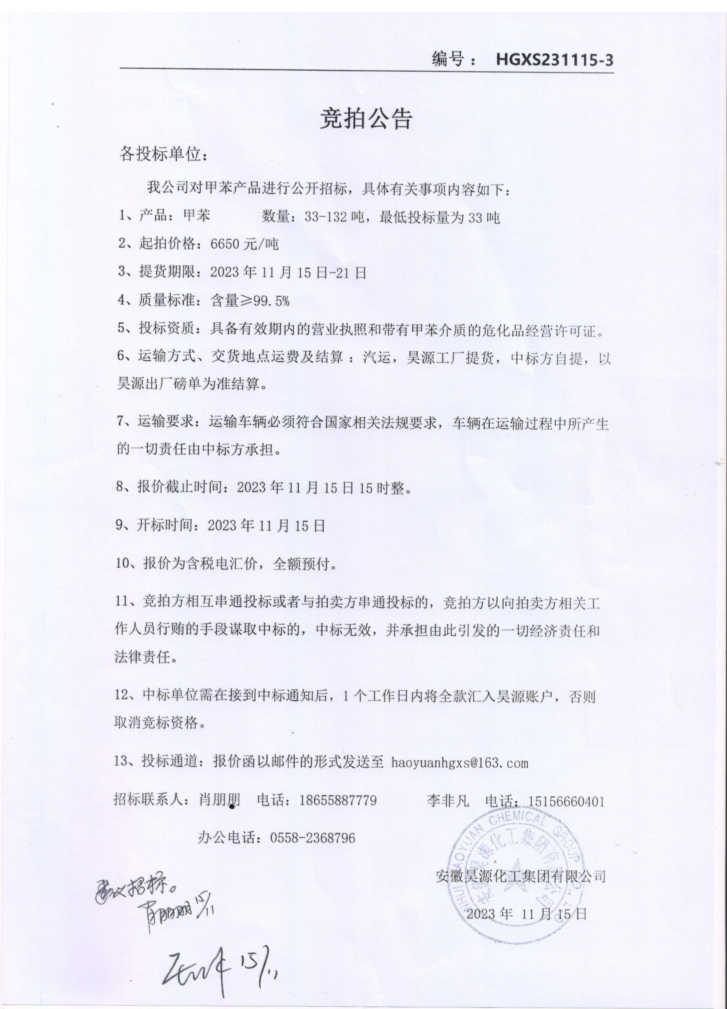 上一條:化工銷售公司碳酸二甲酯競(jìng)拍公告下一條:化工銷售公司乙醇競(jìng)拍公告