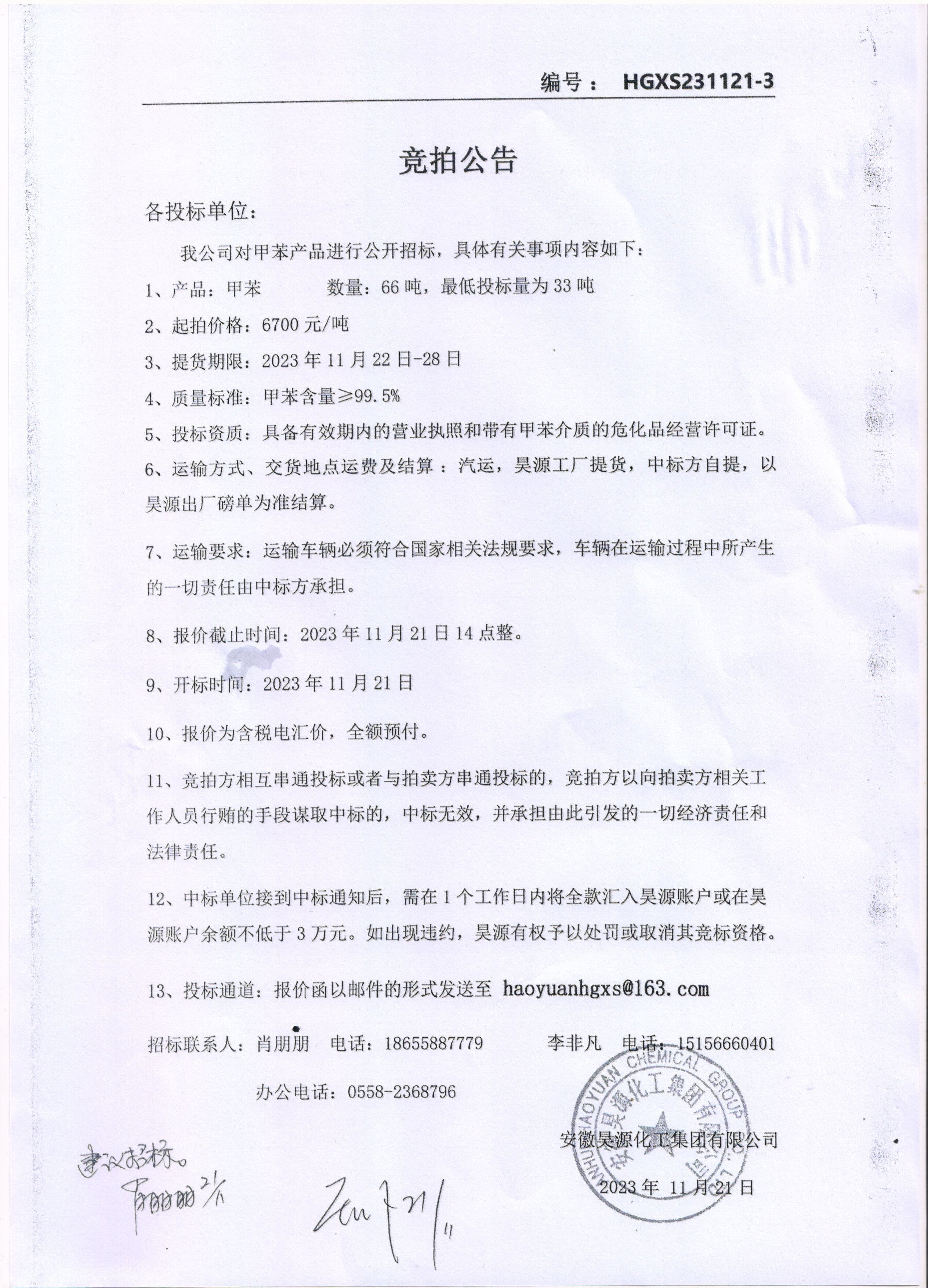 上一條:化工銷售公司乙醇競(jìng)拍公告下一條:化工銷售公司粗甲醇競(jìng)拍公告
