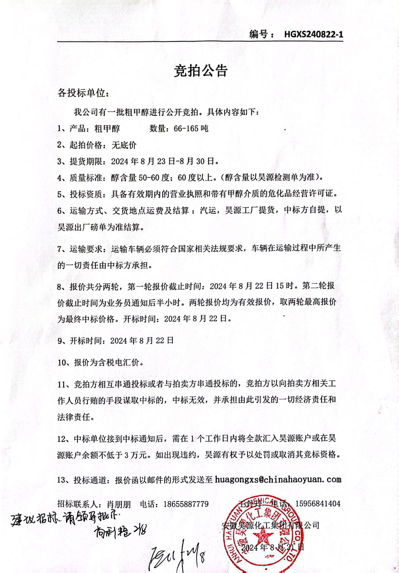 上一條:化工銷售粗甲醇銷售招標(biāo)公告下一條:化肥銷售工業(yè)鹽、無水硫酸鈉銷售招標(biāo)公告